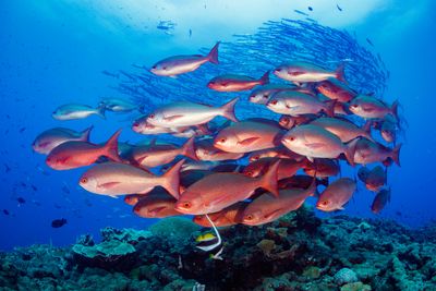Unquestionably, the biggest attraction of the dive is the fish life. Schools of barracuda, trevally, sea perch, fusiliers, and unicornfish feed in the currents just beyond the reef, joined on occasions by sharks and tuna. As they round the point they sometimes come so close to the reef that a diver sitting quietly can almost touch them.