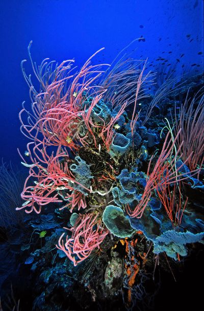 The sponge garden includes many bright orange sponge mounds. Many of the sponges have heaps of crinoids clinging to them, affording the crinoids and elevated position from which to feed in the current. Near the end of the sponge zone, in 60 feet/18 meters of water, is the boat mooring, beyond which there is a sparser mixture of sponges and sea fans. On both sides of the shoulder the reef slopes downward to a sandy bottom. To the north there are additional ridges and ravines, and more sea fans.