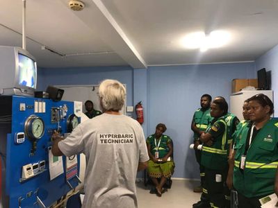 Hyperbaric Partners Limited (HPL) operates a Twin Lock unit to international guidelines in Port Moresby. Evacuation with nursing support for injured diver stabilization and oxygen therapy is arranged using pressurized jet aircraft.